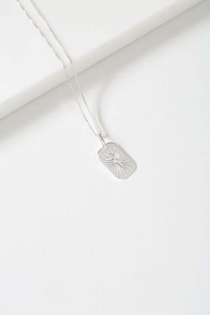 Este colar Kayro em prata 925 traz um pingente retangular com a imagem de Cristo crucificado, irradiando fé e devoção. A peça possui acabamento detalhado e design clássico, sendo uma joia que simboliza proteção espiritual e religiosidade.