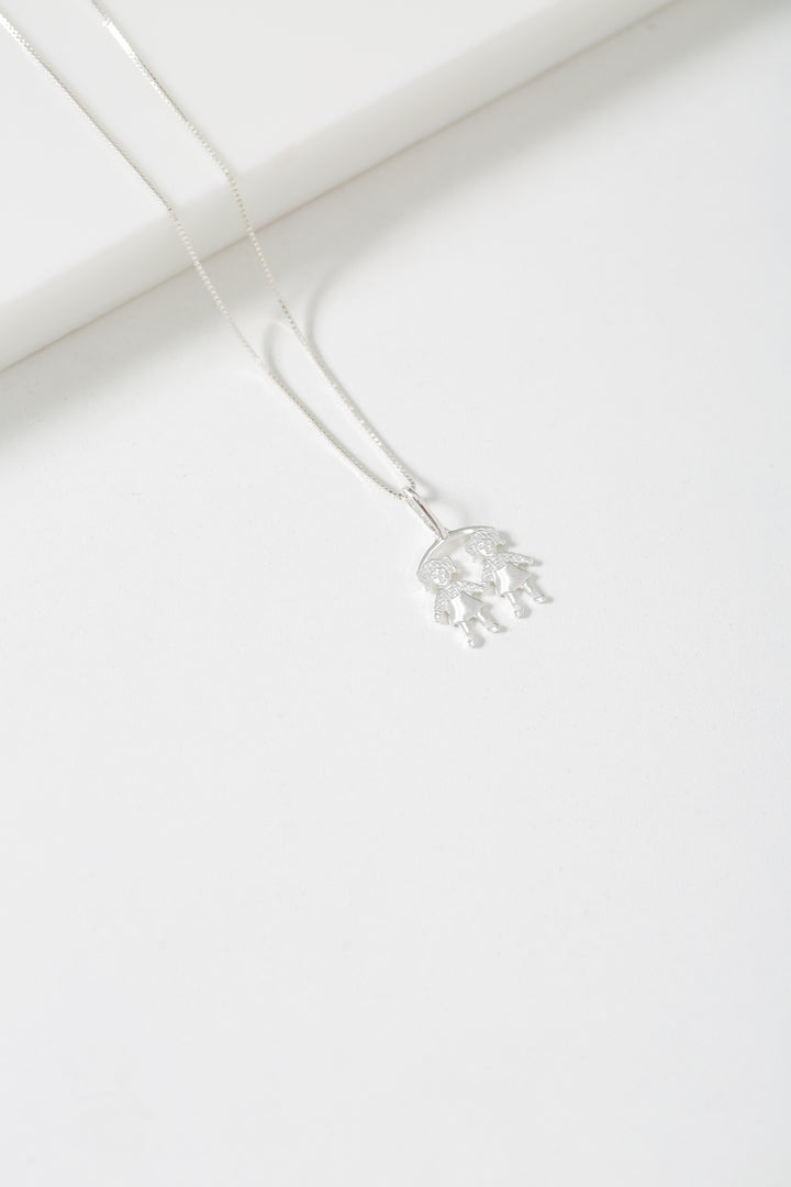 Afeto que se traduz em forma. O Colar Veneziana Kayro em prata 925 traz um delicado pingente de duas meninas de mãos dadas, em dimensões de 25mm x 20mm. Uma joia cheia de significado, perfeita para representar irmãs, filhas ou laços especiais de amizade e família.