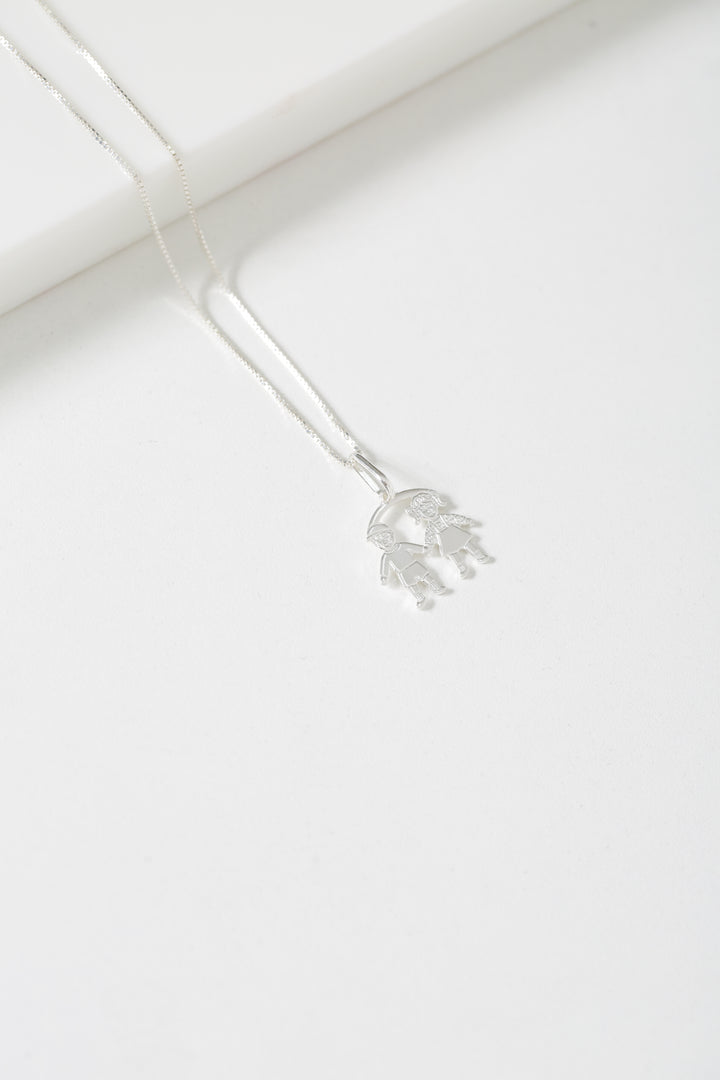 Uma joia que simboliza laços eternos. O Colar Veneziana Kayro em prata 925 traz um pingente delicado representando um menino e uma menina de mãos dadas, em dimensões de 20mm x 20mm. Um colar especial para mães, avós ou familiares que desejam carregar a lembrança e o amor dos filhos sempre junto ao coração.