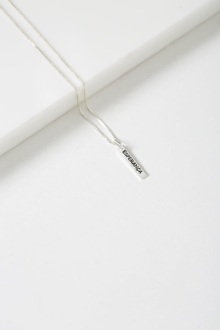 A Esperança representa fé no futuro, otimismo e renovação. Este colar Kayro em prata 925 traz um pingente retangular delicado, com a palavra “Esperança” gravada, simbolizando confiança em dias melhores e força interior.