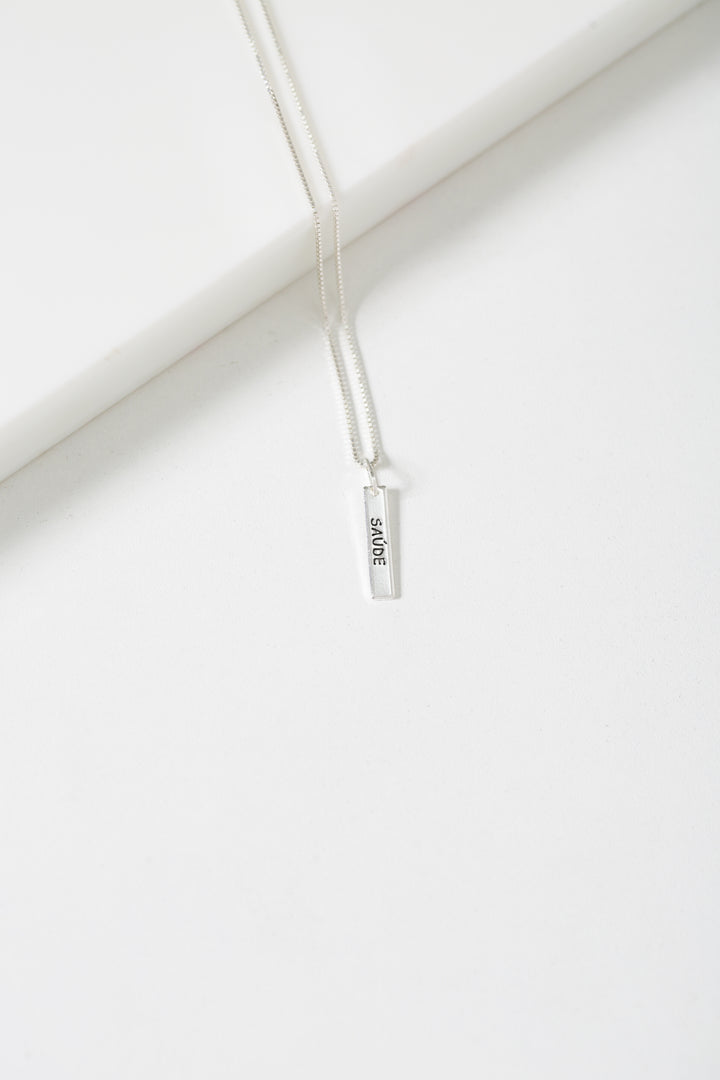 A palavra Saúde simboliza bem-estar, equilíbrio e vitalidade. Este colar Kayro em prata 925 traz um pingente retangular com a inscrição “Saúde”, representando um amuleto de proteção e energia positiva para o dia a dia.